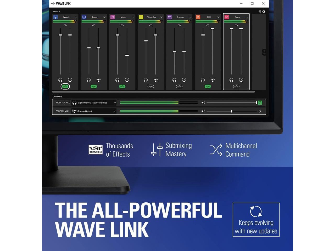 - Wave Link App: control Wave:3 and up to eight other audio sources, plus create two independent mixes.