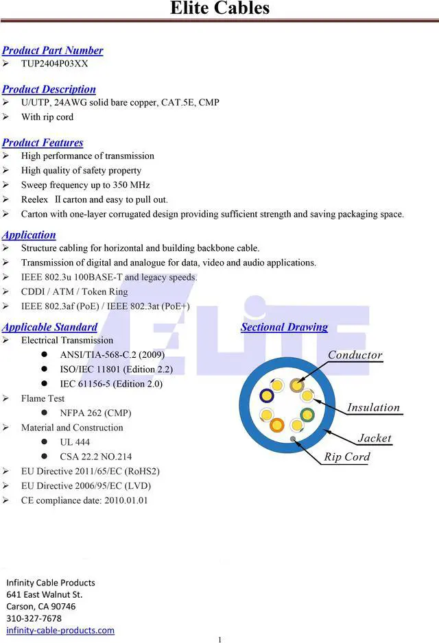 • Elite Cat5e Plenum (CMP) is 1000ft, 4 Pair, 24AWG, 4 Unshielded Twisted Pairs (UTP), Solid Bare Copper.