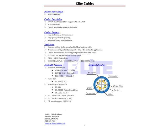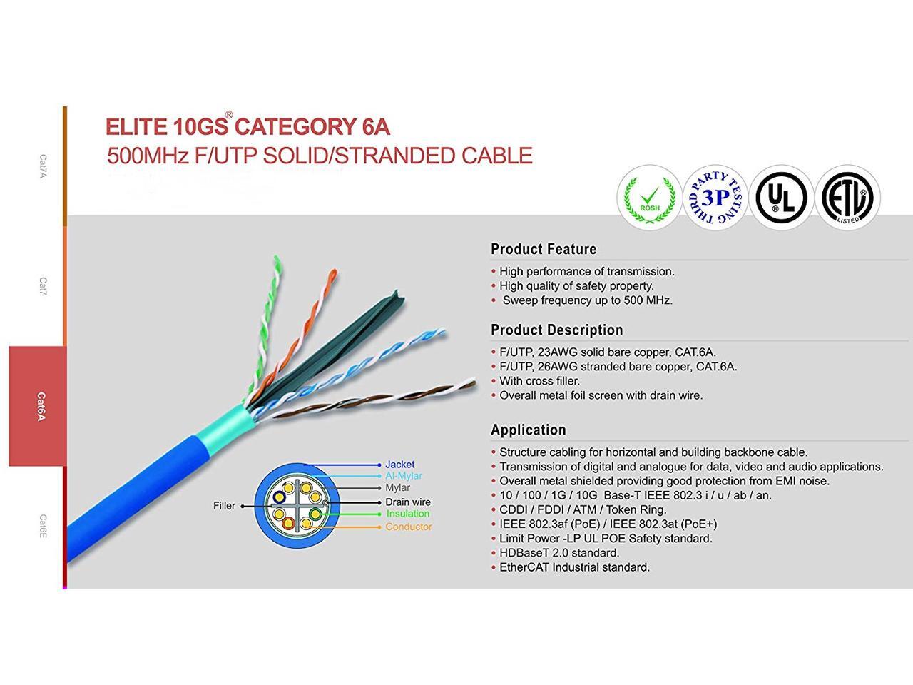 - Elite Cat6a Shielded Riser (CMR) is 1000ft, 23AWG, Solid Bare Copper, 4 Unshielded Twisted Pairs with an overall foil shield around all 4 pairs,