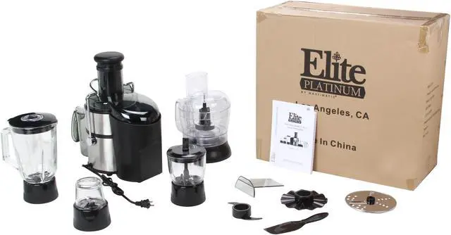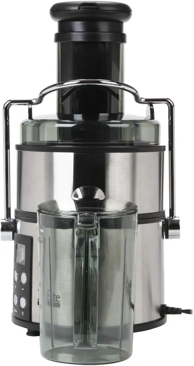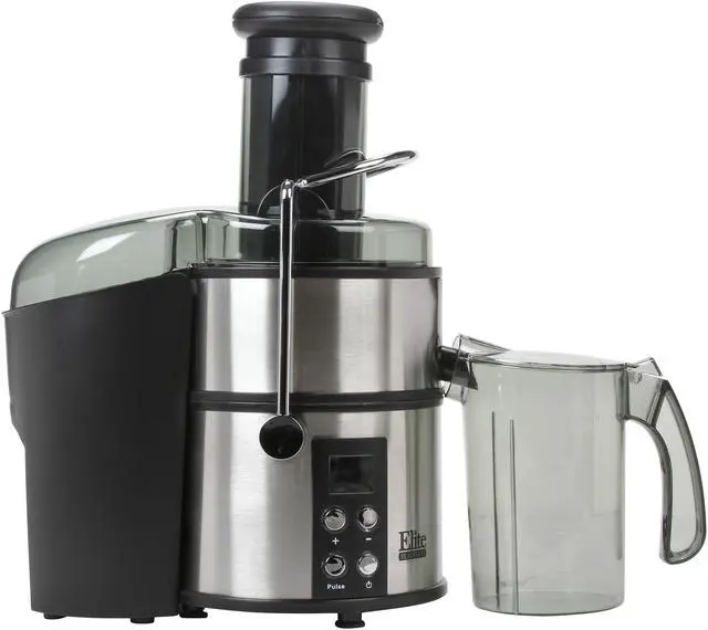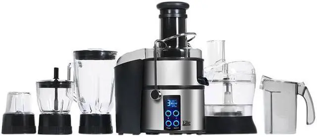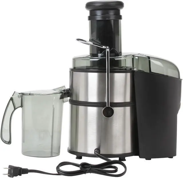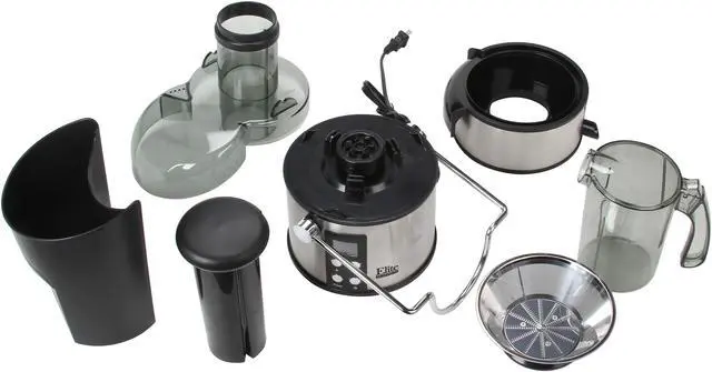 | Features | Sleek, modern design. Juice whole fruits such as apples, carrots, pears, etc... Easy to operate. Easy to clean. Stainless steel filter. Multiple speed control and pulse function with LED indicator lights. Multifunctional unit good for blending, juicing, chopping, emulsifying, slicing, and shredding. Stainless steel locking handle with safety switch construction. Large feeding chute able to fit whole apples and many other varieties of large fruits and vegetables Extra large pulp container to easily discard unwanted pulp 800 Watts Detachable parts for easy cleaning Dishwasher safe parts and accessories |