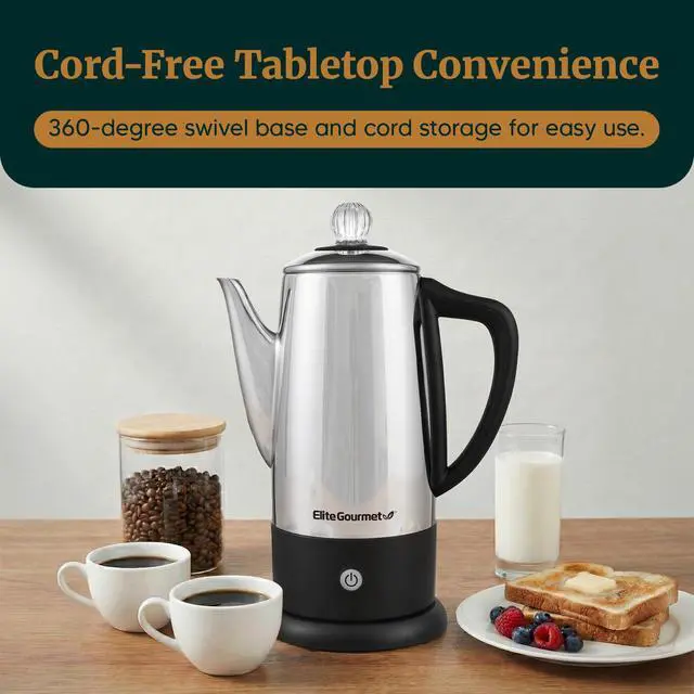 WRAP AROUND CORD STORAGE and non-slip feet as well as 360° swivel base for Easy Tabletop Cord-Free Serving. This makes the Percolator completely portable and you can serve coffee away from the kitchen if you wish