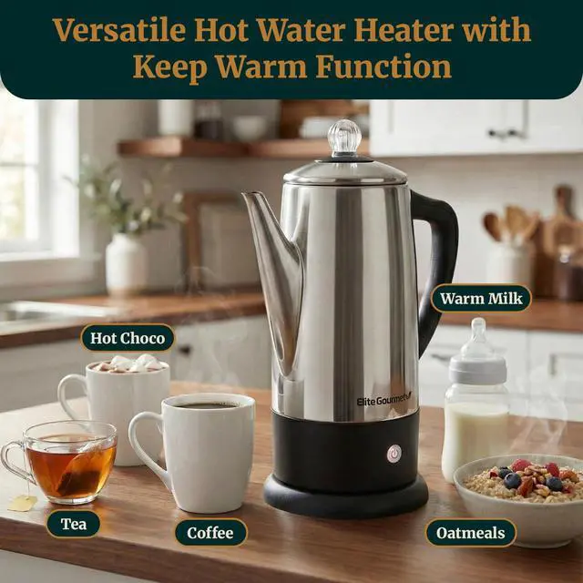 BREW UP TO 12 CUPS of hot, flavorful and fresh coffee or tea in less than a minute per cup. Using the simple On/Off switch and Keep Warm function, you can turn on the percolator and let it brew and switch to keep warm automatically.Filter type:Reusable