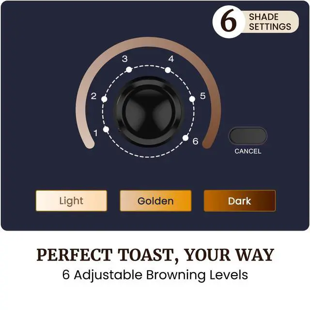 EVEN, CUSTOMIZABLE BROWNING: 6 adjustable shade settings let you toast from lightly golden to crispy dark. Self-centering guides help position bread for more consistent heat distribution. Start on level 23 for first use and adjust to your preference.