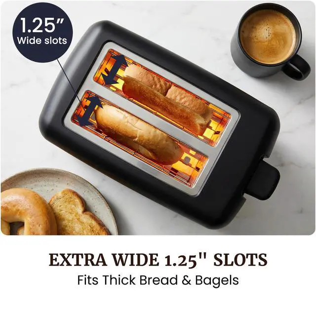 XTRA WIDE 1.25 SLOTS: Easily fits bagels, waffles, English muffins, and thick-cut specialty breads without jamming or uneven edges.