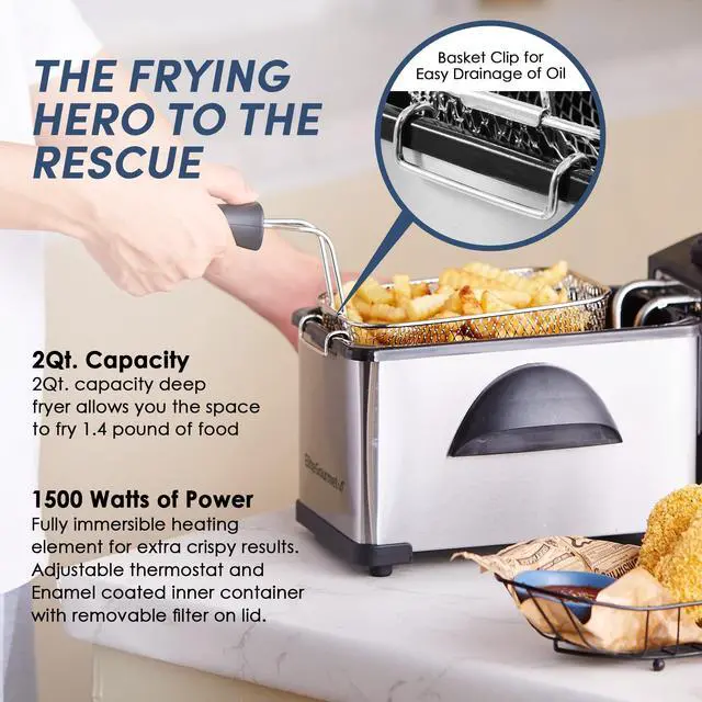 Efficient - Its powerful 1500-Watt heating element rapidly fires up the deep fryer's full capacity of 2L (68 oz) in just a few minutes! It also always automatically maintains the correct temperature of oil so there's no need to adjust.