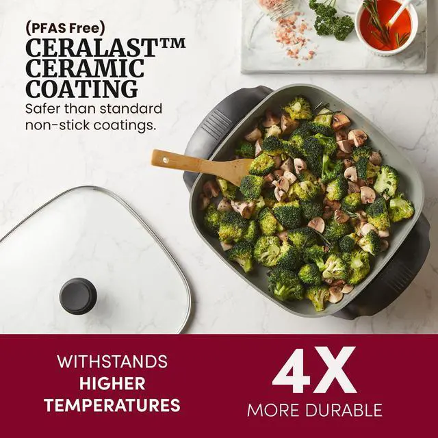 PFAS FREE CERAMIC COATING: Safer and faster-heating than traditional ceramic surfaces, it provides a healthier, stronger, and scratch-resistant cooking surface. Food releases easily without chipping, making cleanup quick, safe, and hassle-free.