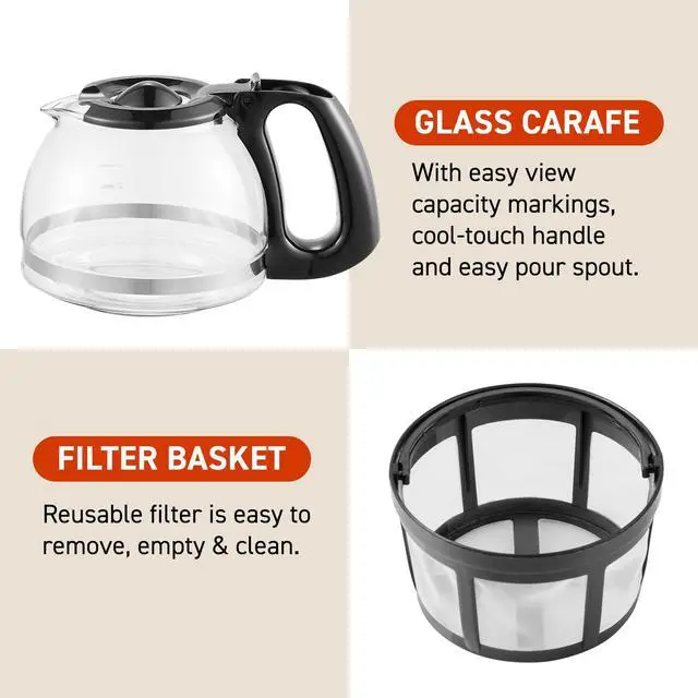 • 4 CUP GLASS CARAFE for brewing the perfect quantity of hot fresh coffee for an individual or a small group of people.