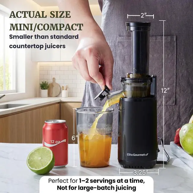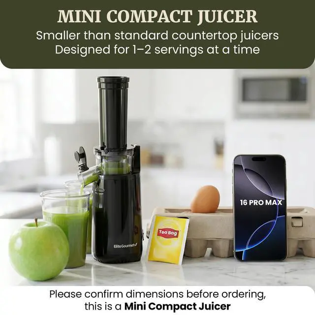 • MINI COMPACT JUICER (Single-Serve Size): This is a mini / compact juicer - smaller than standard countertop juicers. designed for 12 servings at a time (includes 16 oz juice cup). Not intended for large-batch juicing or filling multiple bottlesplease confirm size before ordering.