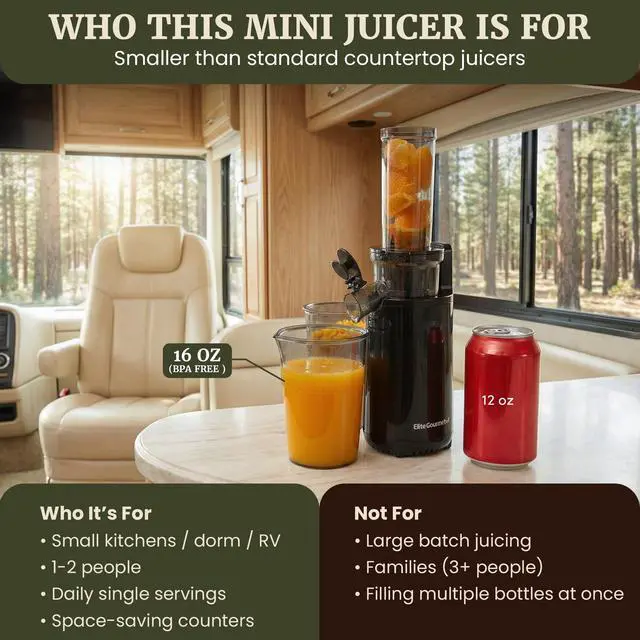 • Not intended for large batch juicing or filling multiple bottles at onceideal for compact counters, dorms, RVs, and daily single servings.