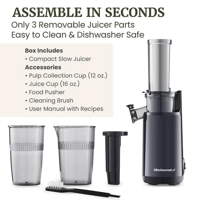 EJX600 Mini Compact Small Space-Saving Masticating Slow Juicer Cold Press Juice Extractor, Nutrient and Vitamin Dense, BPA-Free Tritan, Easy to Clean, 16 oz Juice Cup, Charcoal Grey