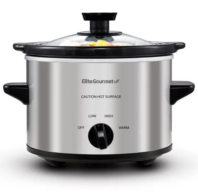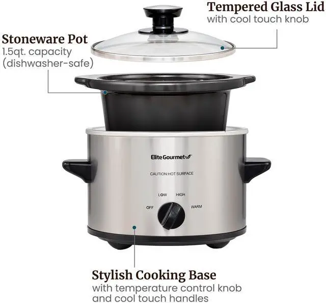 The Elite Gourmet 1.5 qt. Mini slow cooker is perfect for cooking and serving small one-pot meals and appetizers such as soups, stews, meatballs, dips, and sauces. It's a great kickoff for a fondue party or where everyone prepares their favorite dip in their 1.5 qt. Mini slow cooker. This versatile small appliance can be a single person's best companion as well as the All-Star at your next super bowl party. It features low and high temperature settings, A keep-warm setting allowing you to keep your meal hot and fresh before It's served, and an attractive Stainless Steel finish. It includes a removable inner stoneware pot that's easy to clean, with a tempered glass lid with metal rim for easy viewing of cooking cycle and cool-touch handles and knob for safe handling.