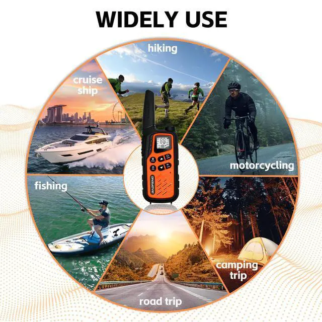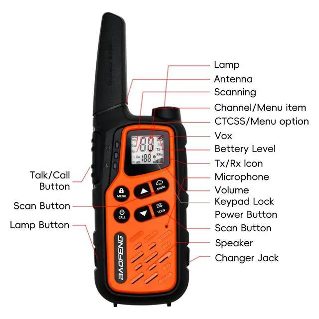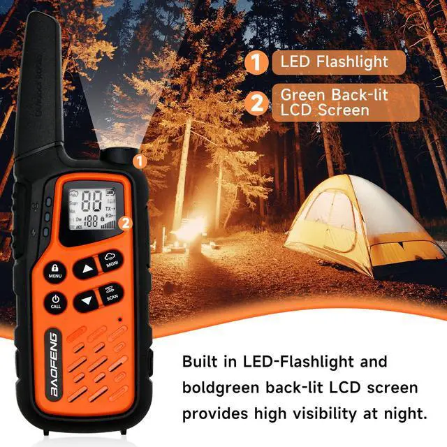 22 FRS Channels Output power: 2W (channels 1-7and 15-22) 12 NOAA Weather Channels NOAA Weather Scan 2 Channels Watch Privacy Codes Scan and Store Channel Monitor Channel Scan Function 155 Privacy Codes (50 CTCSS codes/ 105 DCS codes) 10 Selectable Call Alerts Hands-Free Operation (VOX) Call Alert Roger Beep Tone Keypad Lock Battery Level Meter Emergency Strobe Light Battery/Power Saver Backlit LCD Display Low Battery Audible Alert TOT (Time out timer) 2pin Kenwood headset jack Type-C USB connector for charging Li-Ion 1500mAh battery pack Keystroke Tones Up to 5 km range* Battery Life: up to 18 hours (under typical use conditions)