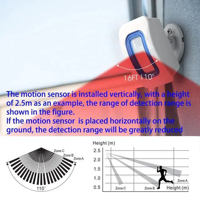 Motion Sensor: The motion sensor activates when movement occurs within 16.4ft range x 110°. This transmits a signal to the plug-in receiver and alerts you with a ringtone.