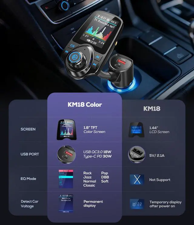 Upgraded Version of Classic KM18: New KM18 adds a 1.8 TFT color display, offering a wider visual interface to show incoming phone numbers, track names, FM frequencies, battery voltage, Bluetooth-connected devices, etc
