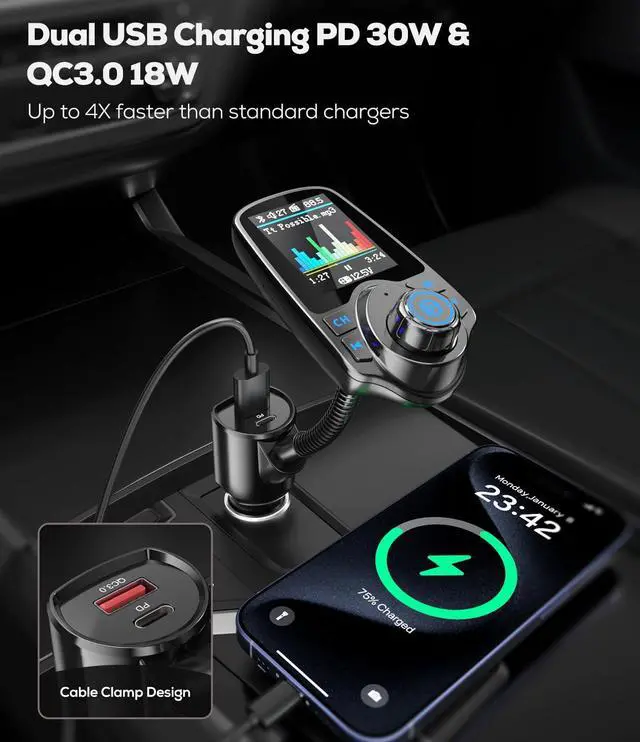 [2026 KM18 Upgraded Version] 1.8" Color Screen 48W Bluetooth 5.4 Car Adapter, Dual Fast Charging Ports [PD 30W & QC3.0 18W] Wireless Radio FM Transmitter, Hands-Free Call, 7 EQ Modes, Black