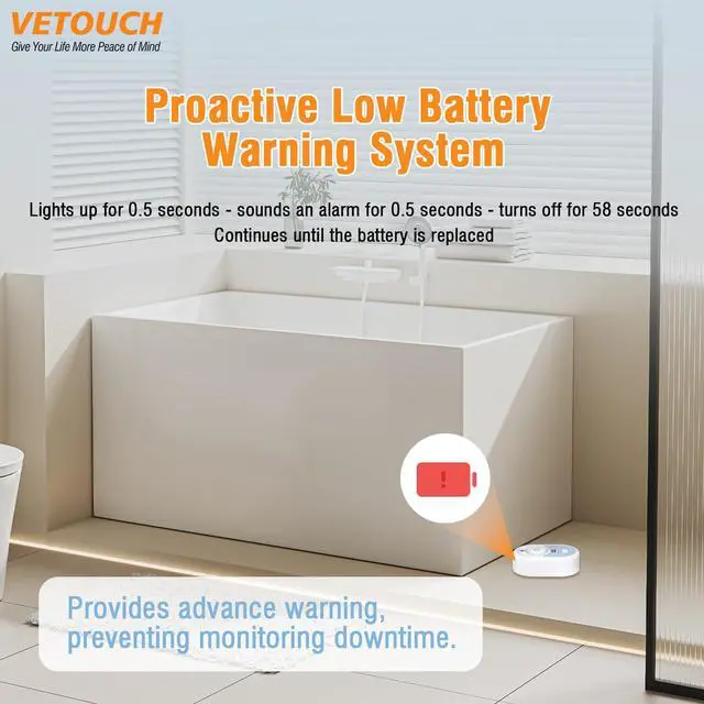 Extended 5-Year Battery Life in Standby ModeEngineered for long-term reliability, this water alarm consumes minimal power during standby, providing up to 5 years of continuous protection on just 2 AAA batteries for peace of mind.