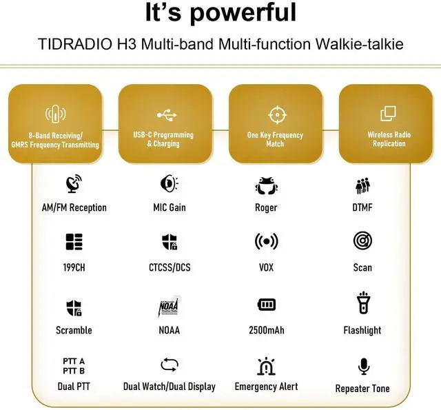 New Technology from TIDRADIO TD-H3 GMRS radio: 1) GMRS Frequency transmitting and 8 band receiving; 2) Type-C programming; 3) Airband and FM reception; 4) Wireless Radio Replication; 5) One Key Frequency Match; 6) Version Switch; 7) Updatable Firmware and so on.