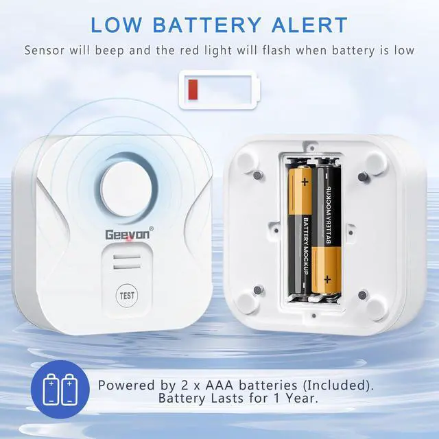 Powered by 2 x AAA batteries(Battery Included), the battery will last for about 12 months for normal use. With low-battery alert function, the water sensor alarm will beep and flash a red light when the battery is low.