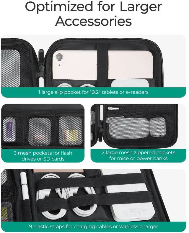 Yes! This tech organizer includes 9 elastic straps for chargers, cables, and flash drives. There are also 3 small mesh pockets for keeping flash drives or SD cards secure and easily accessible.