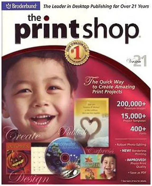NEW! The Print Shop 21 is like having your own creative agency at home! 200,000+ images and graphics Plus! 15,000+ project templates! Endless new images, tools, colors, projects and artistic effects give you the power to create anything – from greeting cards to brochures to mass mailings with address book and mail merge. You get MORE! Images & Projects; NEW! Borderless Printing capability and more Avery templates than ever before to make printing fast and easy! Advanced photo editing features means you can personalize any project with your own photos and share them by creating slideshows and burning to CD. You've never had so many possibilities!
