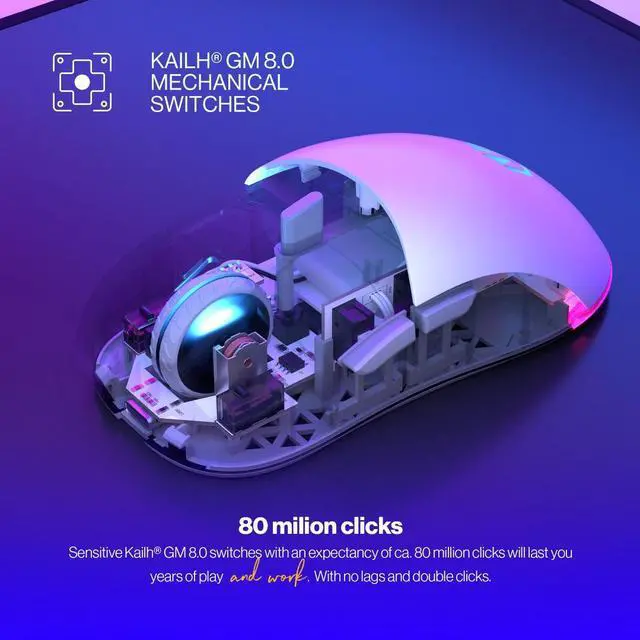 Quick (meaning, they process every click within a fraction of a second) and durable Kailh® GM 8.0 switches with an expectancy measured around 80 million clicks guarantee long working hours with no lag and double clicks - even after years of usage.