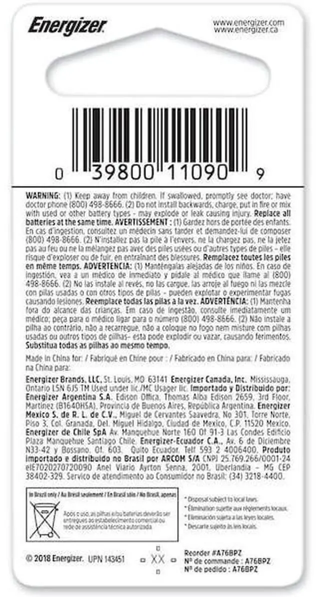 Button Cell Battery, Battery Size A76, Battery Chemistry Alkaline, Voltage - Batteries 1.5V DC, Standard Battery Pack Size 1, Capacity - Batteries 175 mAh, Battery Cross-Reference 157, 303, 357, AG13, EPX76, LR44, SG13, SR44, Drain Type - Battery High Drain, Diameter 0.457 in, Depth 0.213 in, Standards ANSI / NEDA-1166A, IEC-LR44, Color Code No Code. This item has been restricted from sale in the following state (s): []