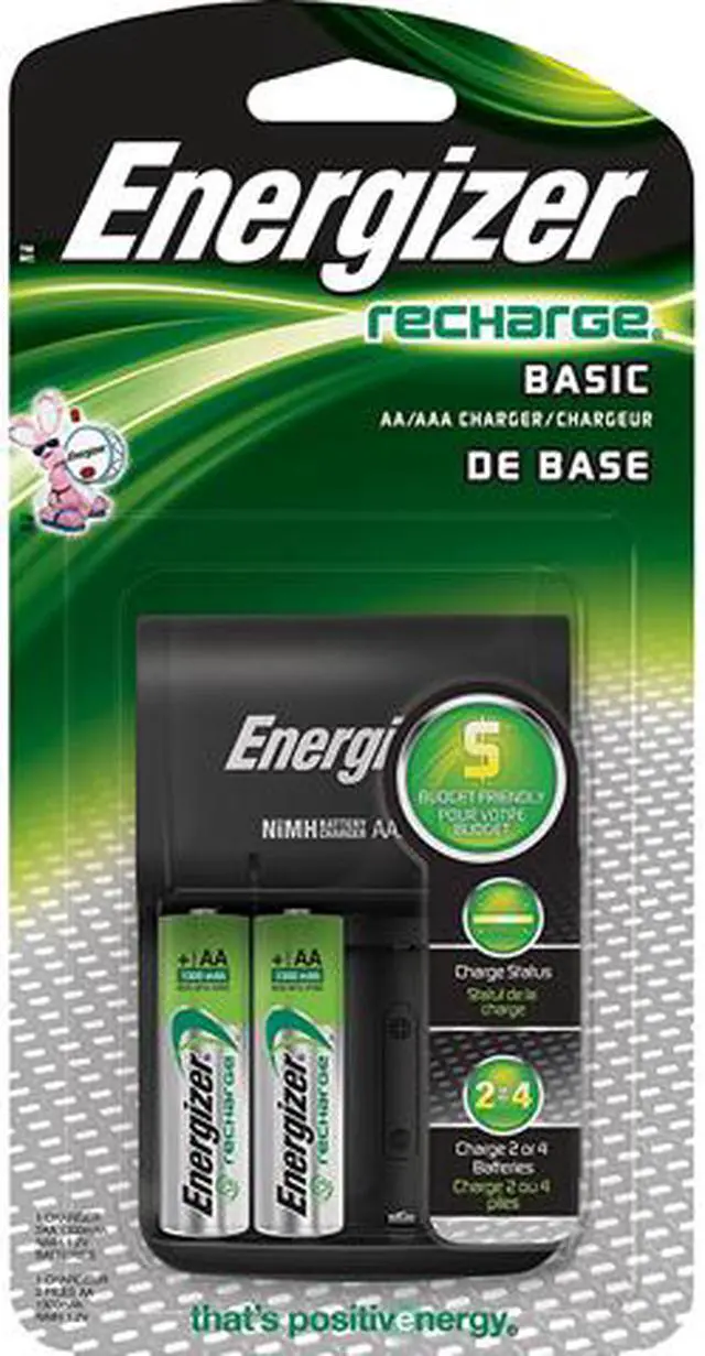 Meet the affordable choice to keep your rechargeable batteries going. The Energizer Basic Battery Charger charges 2 or 4 AA or AAA NiMH batteries in 8 hours.* And it's easy to use: Just load your batteries into the charging channels, plug into the wall, and get on with your day. The green indicator light lets you know it's charging. When your batteries are complete and out of the device, simply tuck in the fold-out plug and stow away for safe-keeping. Save money and stay charged with the long-lasting and reliable power of Energizer Recharge, the world's #1 rechargeable battery brand (according to market survey data). Specs at a Glance: 4 charging channels charge 2 or 4 AA or AAA NiMH batteries Comes with two (2) 1300 mAh 1.2V AA Energizer Recharge Batteries Charge Status Indicator Lights Reverse Polarity Protection Limited Lifetime Warranty (see manual for details)Number of Batteries Supported: 4Battery Size Supported: AABattery Size Supported: AAASupported Battery Capacity: 1.30 AhPackage Contents: Basic Charger for NiMH Rechargeable AA and AAA Batteries 2 x 1300 mAh 1.2V AA Batteries Limited Warranty: LifetimePackage Contents Basic Charger for NiMH Rechargeable AA and AAA Batteries 2 x 1300 mAh 1.2V AA Batteries