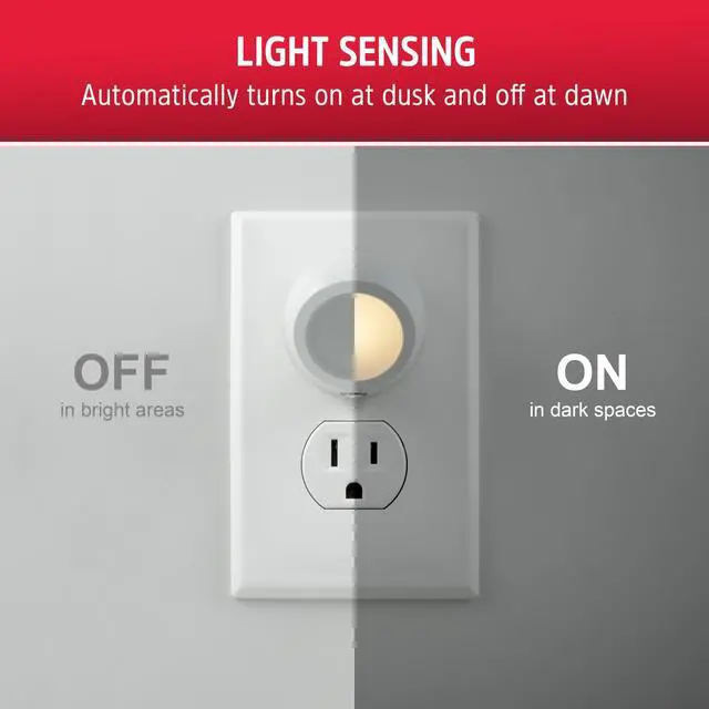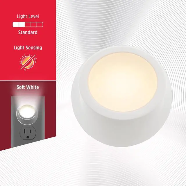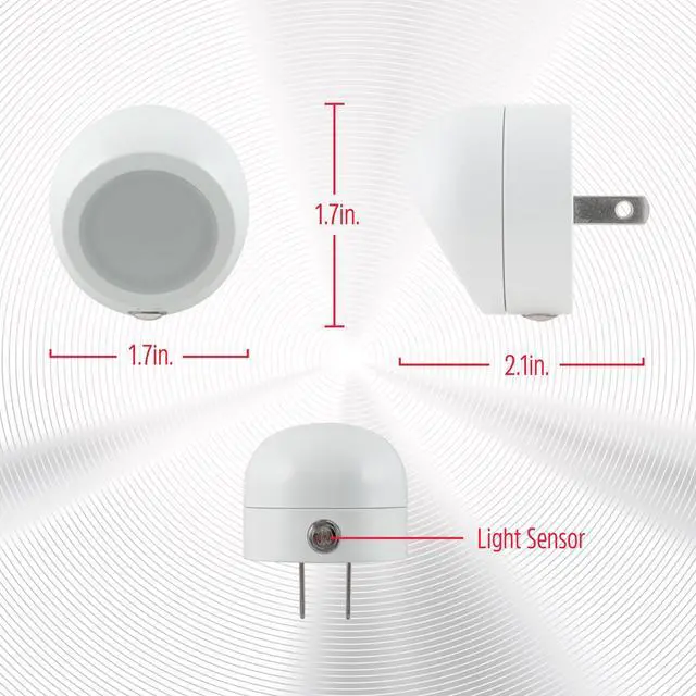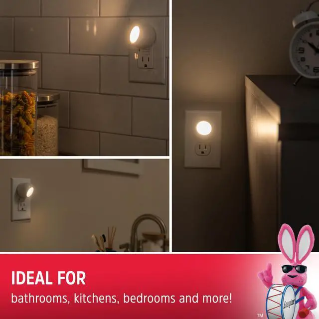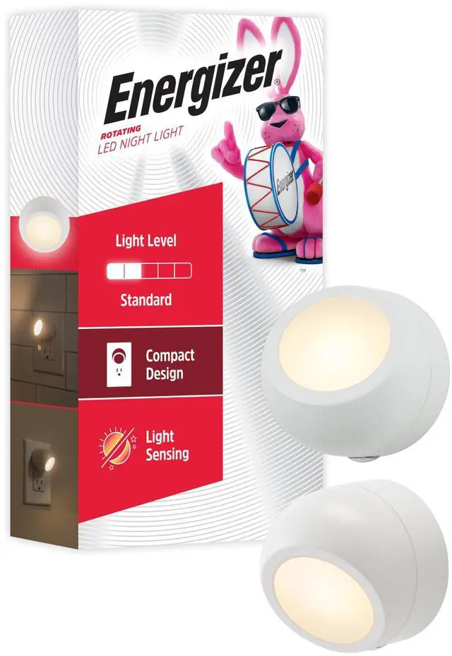 A little light goes a long way with Energizer Rotating Night Lights. This specialty LED night light creates a path of illumination to guide you safely through a dim room or hallway at night. The innovative design features a directional spotlight that allows you to rotate the night light 360° and aim the light wherever need it. The night light functions perfectly in bedrooms, staircases, hallways, bathrooms and more. Theres no need to unplug the night light during the day the light includes a built-in sensor helps keep energy costs down by automatically turning the light on at dusk and off at dawn. The night light comes in an attractive, glossy white finish with a fully enclosed, soft white LED. Shine through the night with the Energizer Rotating Night Lights.