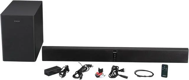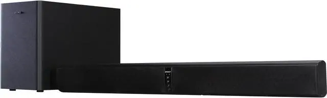 | Features | Two-way speaker driver design Digital optical and RCA cables included Wireless side-firing subwoofer Features Dolby Digital Decoder 3D Surround Mode Remote control learning feature Proprietary Convergent Source Module (CSM) technology for increased dispersion Elegant black satin finish |