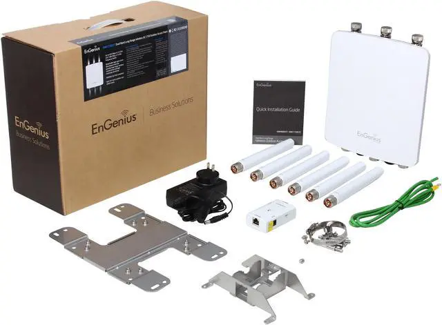 ENH1750EXT Outdoor Access Point 3 Detachable 5 dBi 2.4 GHz Omni-directional Antennas 3 Detachable 7 dBi 5 GHz Omni-directional Antennas Power Adapter (48V/0.8A) PoE Injector (EPE-48GR) Grounding Cable Pole Mount Bracket Wall Mount Base Mounting Screw Set Quick Installation Guide
