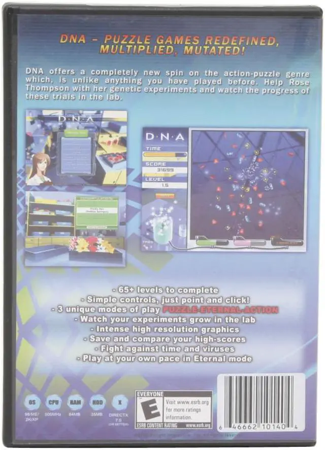 | Features | DNA offers a completely new spin on the action puzzle genre. You have to help graduate student Rose Thompson with her genetic experiments; Combine different colored proteins to create entirely new cells under a microscope to grow all kinds of amazing flowers. Make sure she fills her daily quota before time runs out. Fight against time and Viruses that can contaminate her experiment! 3 unique modes: Eternal, Puzzle and Action 67 levels to complete Original Sound effects and music Simple, intuitive point-and-click play Intense, high-resolution graphics Watch your progress in the lab Save and compare high scores |