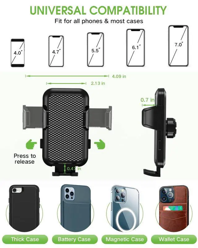 - Universal Phone Holder- Width of phone holder is adjustable from 2.13"-4.09" to fit all 4"-7" cell phones
