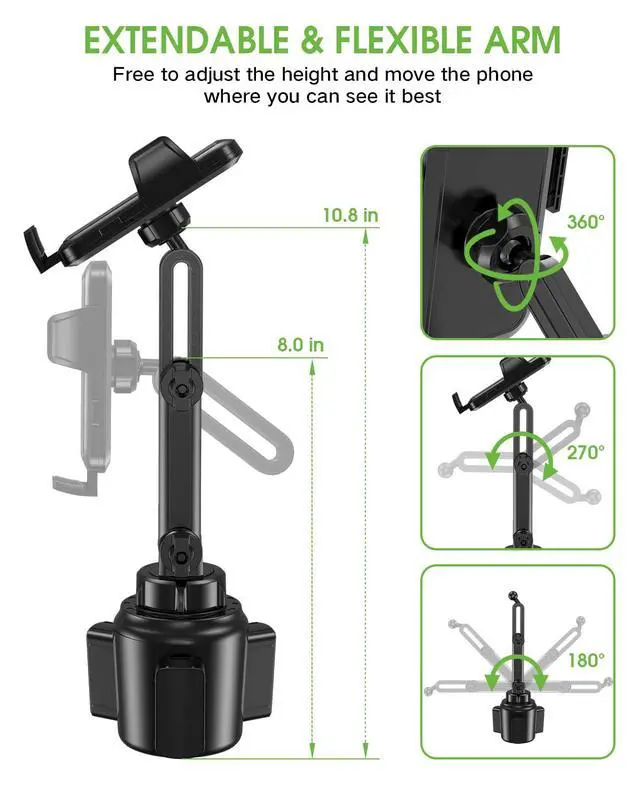 - The height of cup phone holder can be extended from 8 inches to 10.8 inches.