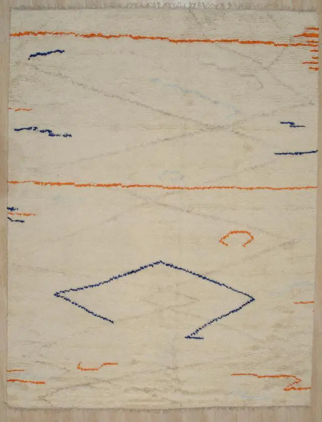 The Hand-Knotted Wool Beige Traditional Geometric Modern Moroccan Rug is a beautiful and artistically crafted piece that seamlessly blends traditional Moroccan design with a modern geometric pattern. Here's a description to capture its essence: