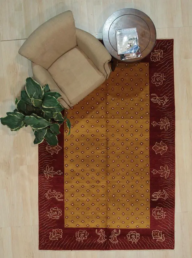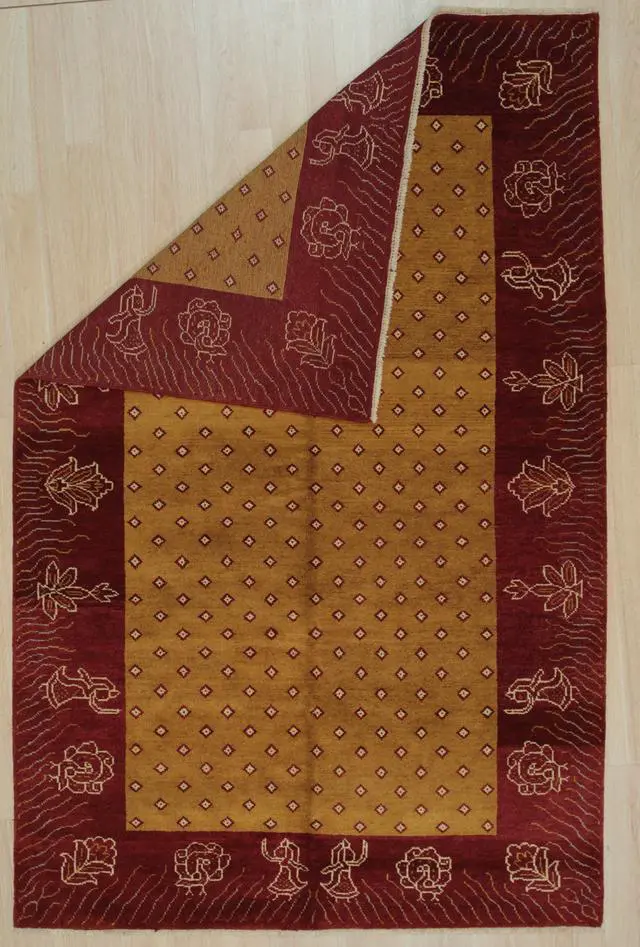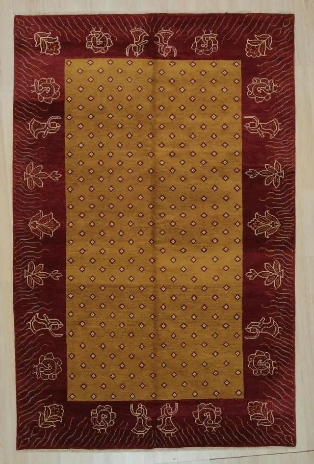 Yellow Transitional Ningxia Rug, 5'10 x 9'1. A Breathtaking Chinese Ningxia Rug Design, Persian Knot, Woven with rich, naturally dyed colors and strong wool pile on a cotton foundation.. Made From 100% wool pile, handknotted by skilled artisans. Ningxia rugs exhibit a distinct Chinese aesthetic, characterized by their qualities of reservation, understatement, and formality. The handle of this carpet is soft and pliable like a good old antique piece.. Ningxia rugs typically utilize subtle shadings of a few different colors, creating a harmonious effect.