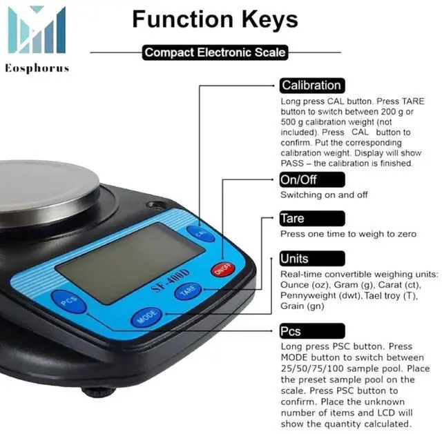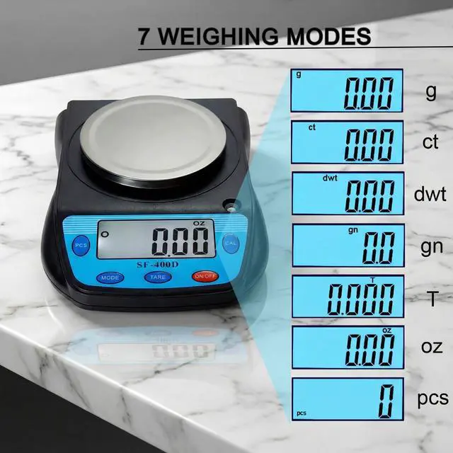 - Weighing modes: Ounce (oz), Gram (g), Carat (ct), Pennyweight (dwt), Tael troy (T), Grain (gn)