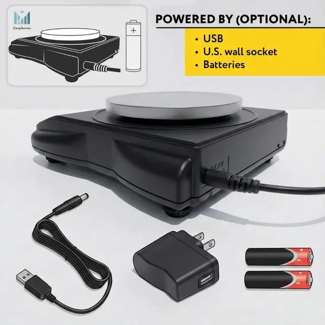 Digital Lab Scale can work either by USB (charging only) or by US outlet through AC/DC adapter. The precision scale can also be powered by 2 x AA batteries (not included) for your convenience.