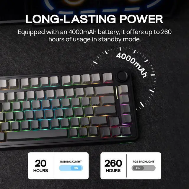 EA75 keyboard is equipped with a 4000mAh battery, providing up to 18 hours of usage with RGB lighting on and up to 200 hours with RGB lighting off.