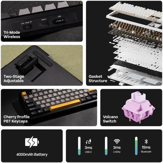Sound Dampening: PO Sandwich Foam, PO Switch Pad, PET Sound-Enhancement Pad, PO Bottom Foam and Bottom Silicone