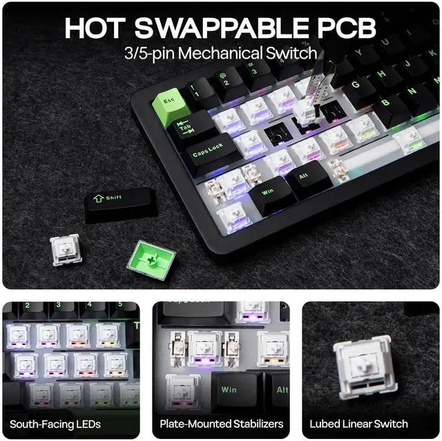 Packed with three modes of connection and an easily accessible mode switch without interruption from charging, The Galaxy68 offers reliable 2.4GHz wireless, low-latency cable mode, and versatile Bluetooth connectivity.