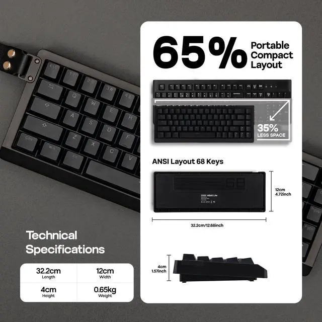 The 65% HE68 Lite gaming keyboard saves desk space, ideal for minimalists. It retains essential keys for full functionality, while its portable, lightweight design suits travel and LAN parties. And the lighter weight adds to its convenience. With keys closer together, it boosts typing and gaming speed. A perfect blend of compactness, utility, and portability, it’s a top choice for efficient, flexible gaming.