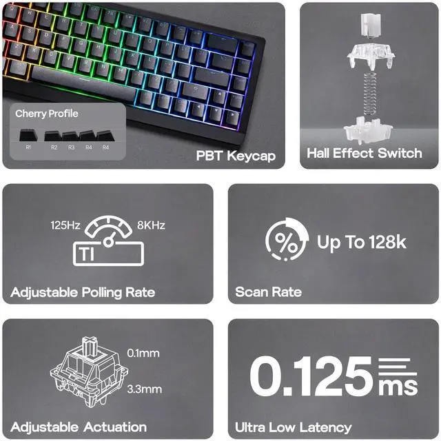 Packed with an Advanced adjustable 8K Polling Rate Chip and Hall effect magnetic switches that eliminate physical contact within the switch, the HE68 Lite wired gaming keyboard delivers an impressive speed of 0.125 milliseconds, 10 times faster than a traditional mechanical keyboard. HE68 Lite upgrades to Cushioned tray-Mount with Poron Foam and foam for exceptional comfort and thocky sound.