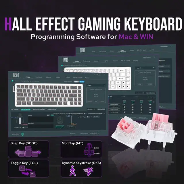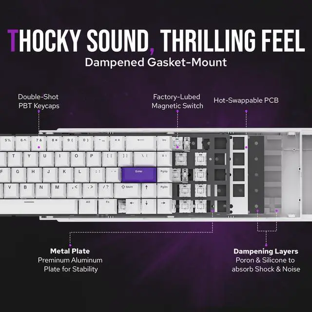 Packed with Advanced 8K Polling Rate Chip and Hall effect magnetic switches that eliminate physical contact within the switch, the HE68 wired gaming keyboard delivers an impressive speed of 0.125 millisecond, 10 times faster than traditional mechanical keyboard. Superior than common magnetic keyboard, HE68 upgrades to Cushioned Gasket-Mount with Poron Foam and Silicone pad for exceptional comfort and thocky sound.
