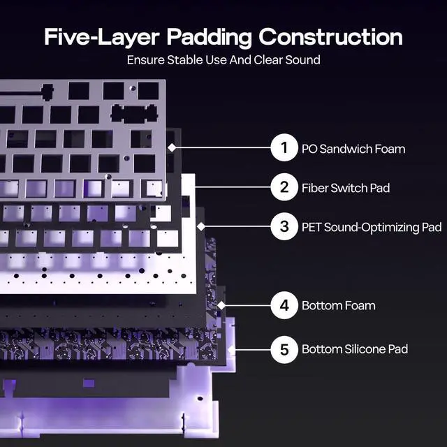 1-Metal Positioning Plate ?2-PO Sandwich Foam ?3-Fiber Switch Pad ?4-PET Sound Dampening Foam?5-PCB Circuit Board?6-Bottom Foam?7-Bottom Silicone Pad