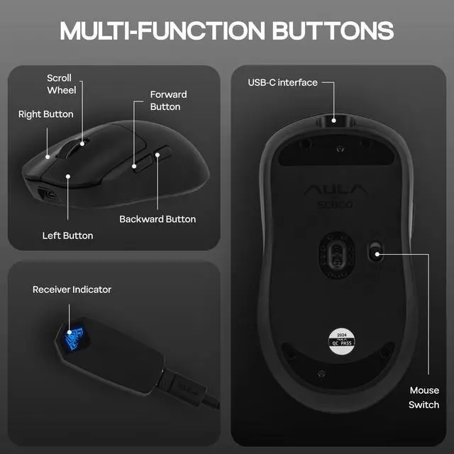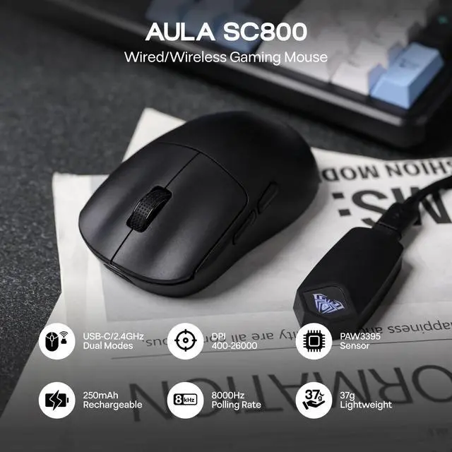 Dual-mode gaming office mouse, meet your dual needs of office and gaming. Wired/2.4G wireless dual-mode free switching, USB-C high-speed connection, plug and play.