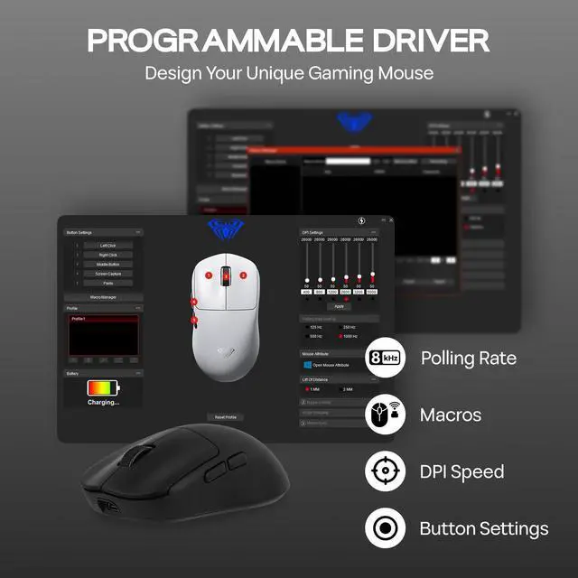 Enjoy up to 60 hours of long-lasting battery life and say goodbye to frequent charging. The driver software monitors the power level in real time, so you can keep track of the remaining power status at any time. The receiver flashes red when the battery is low, like a warning light to remind you to charge in time, to ensure that the critical moments of power, work and play never lose power!
