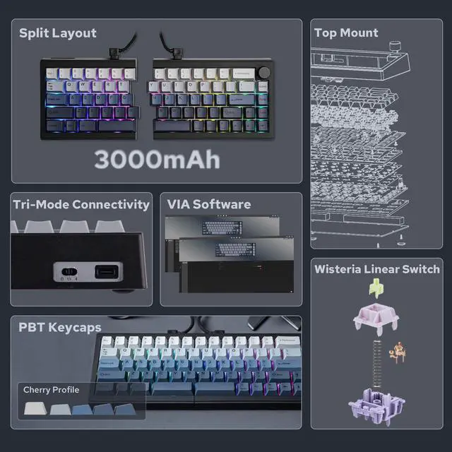 Equipped with EPOMAKER linear switches that are lubricated in the factory, the Split65 keyboard types smooth and lightning-fast with every keystroke. Each key press delivers the perfect amount of feedback, ensuring an unmatched typing experience.