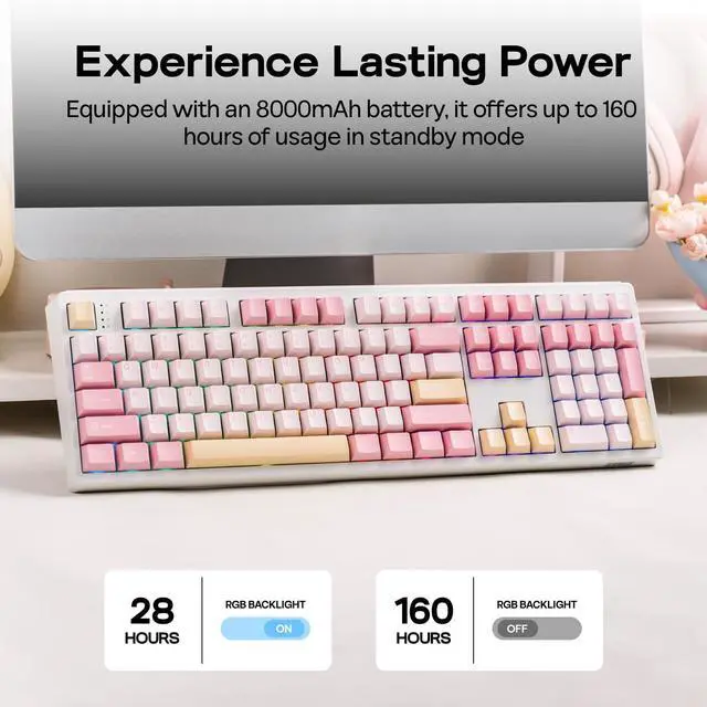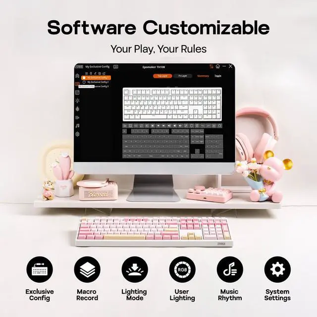 The TH108 mechanical keyboard's RGB backlighting transforms the keys into a mesmerizing river of light, where colors cascade and dance seamlessly across the surface. Choose from dynamic effects like breathing, cycling, and chasing to infuse your typing experience with vibrant energy and motion.