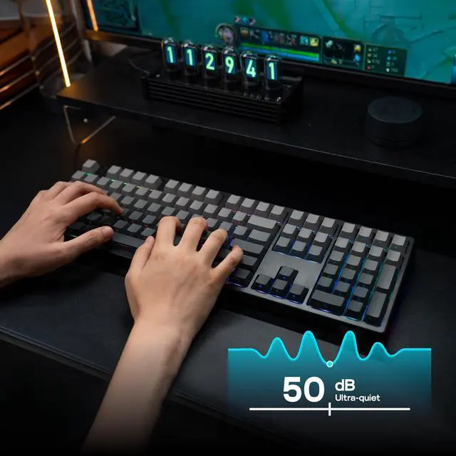 Packed with three modes of connection and an easily accessible mode switch besides the USB port, the TH108 keyboard offers reliable 2.4GHz wireless, low-latency cable mode, and versatile Bluetooth connectivity.
