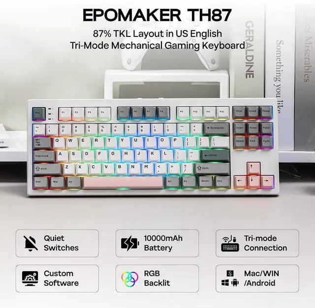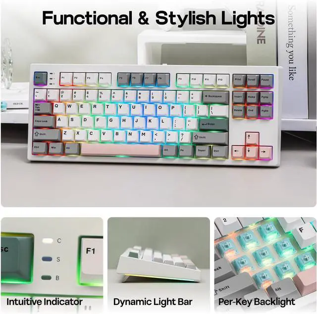 Fast and reliable with anti-ghosting, the EPOMAKER TH87 Gaming keyboard features per-key RGB backlights, fully adjustable in saturation, brightness, and speed, for personalized gaming, and two straps of customizable side lights that reflect on your desk.